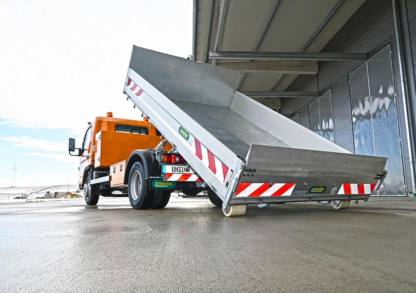 Die Firma «Unsinn Fahrzeugtechnik» hat einen Abrollhaken mit einer serienmässigen «sanften Anlaufsteuerung» entwickelt. Somit werden alle Fahrzeuge der Klasse 6,5 bis zwölf Tonnen Gesamtgewicht mit einer Softsteuerung ausgestattet, die jeden Hakenlift präzise bedienen und die Container sanft sowie geräuscharm heben, senken und kippen lässt. Ein ruckartiges Absetzen von Abrollbehältern gehört nun dank des neuen Systems der Vergangenheit an. Per Funkfernbedienung wird der Hakenlift bequem und intuitiv gesteuert.