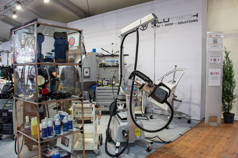 Zum Beispiel das breite Produktengebot von Blutech, welches Firmeninhaber Roger Blum und seine Mitarbeiter (siehe Fotogalerie) in den Fokus gestellt und vorgeführt haben. Diesbezüglich zu erwähnen sind das Kalibrierungssystem «Brain Bee», das Lenkgeometriesystem «Q.Lign» von Beissbarth, die rollende Ausbeulstation «Cdr 1» von «Car-o-Liner» (schafft als «All-in-One-Lösung für kosmetische Reparaturen» Ordnung bei Geräten und Werkzeugen und ist auch fürs Ziehen von Aluminium geeignet) und natürlich der «Micro Blower» – zum Aufrauen einer Felge pustet er extrem feinen Sand in jede Ritze und bereitet so perfekt das schnelle Um- oder Neulackieren vor.