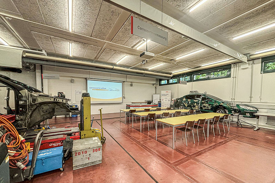 Auch für Weiterbildungsangebote wird das üK-Center genutzt: Der werdende Carrosseriefachmann übt hier das Ersetzen eines Strukturteils und die Blechbearbeitung, der Lehrgang Dellendrücker (ABOL) mit Zertifikat findet hier statt und neu in diesem Jahr führt die Berufsschule im üK-Center auch die Hochvoltkurse Sicherheit und Technik 1 und 2 durch. Die Räumlichkeiten werden zudem für die ASA-Expertenschulung genutzt.