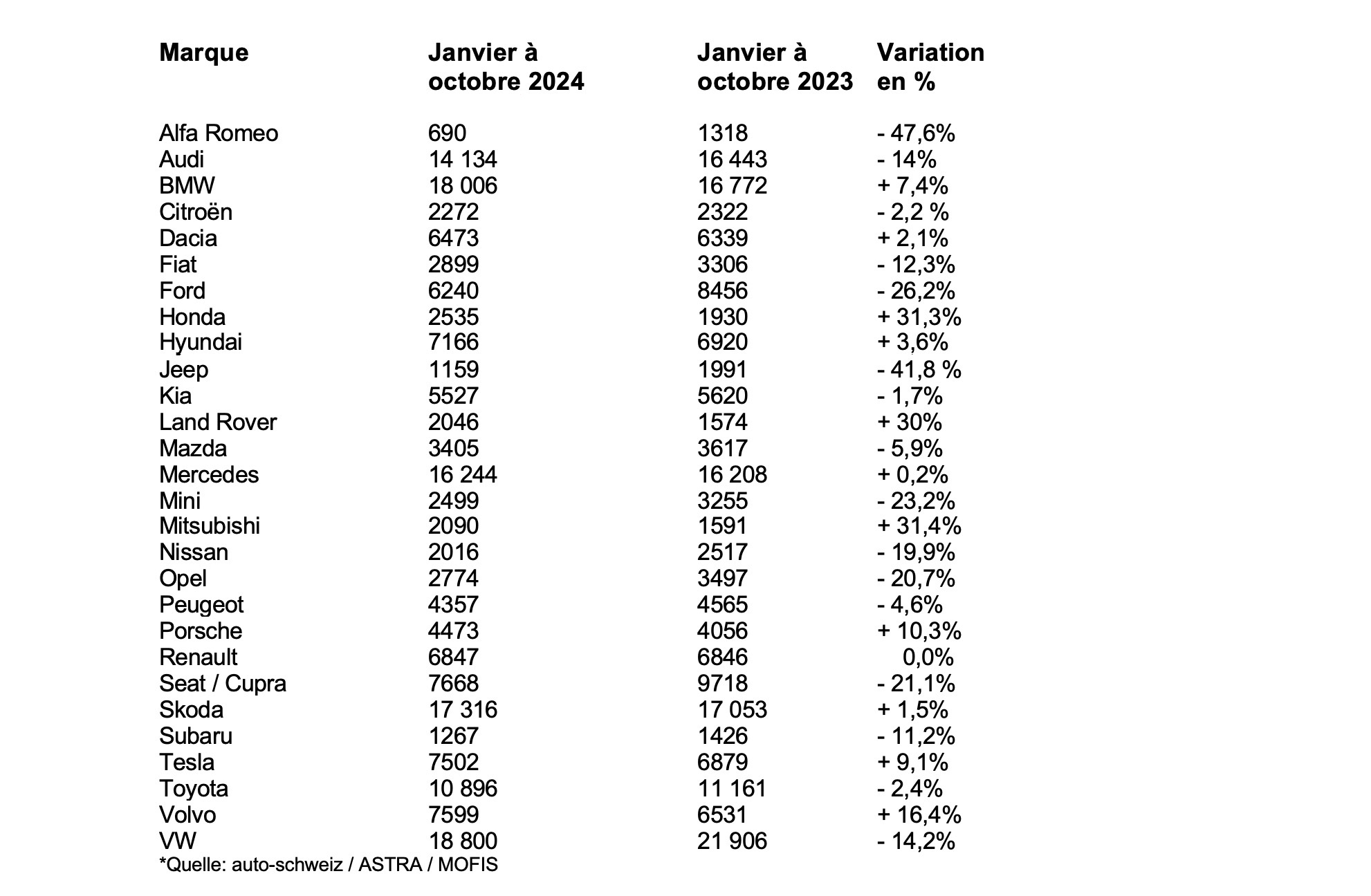 Pas de signe d’accélération : le marché automobile suisse connaît un ralentissement, comme s’il était en panne. En octobre dernier, en Suisse et dans la Principauté du Liechtenstein, 18 753 nouvelles voitures particulières ont été immatriculées – soit une baisse de 7,9 % par rapport au même mois en 2023. Sur l’année 2024, de janvier à fin octobre, on compte 194 483 nouvelles immatriculations, ce qui représente une diminution de 4,3 %.